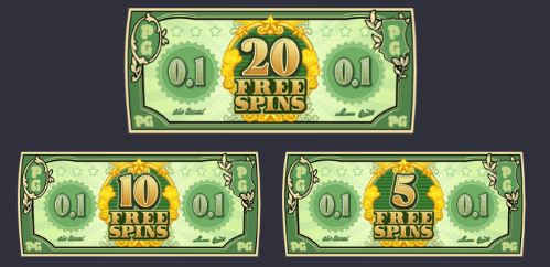 - ในทุกการหมุนฟรีหากมีสัญลักษณ์ฟรีสปินในวงล้อกลางและมีสัญลักษณ์ที่ตรงกันในวงล้อด้านซ้ายสุดและวงล้อด้านขวาสุด ชนะรางวัลจะได้รับตามค่าที่แสดงบนวงล้อใดวงล้อหนึ่งและฟีเจอร์ฟรีสปินจะถูกเริ่มต้นอีกครั้งด้วยจำนวนการหมุนฟรีที่ระบุบนสัญลักษณ์กลาง